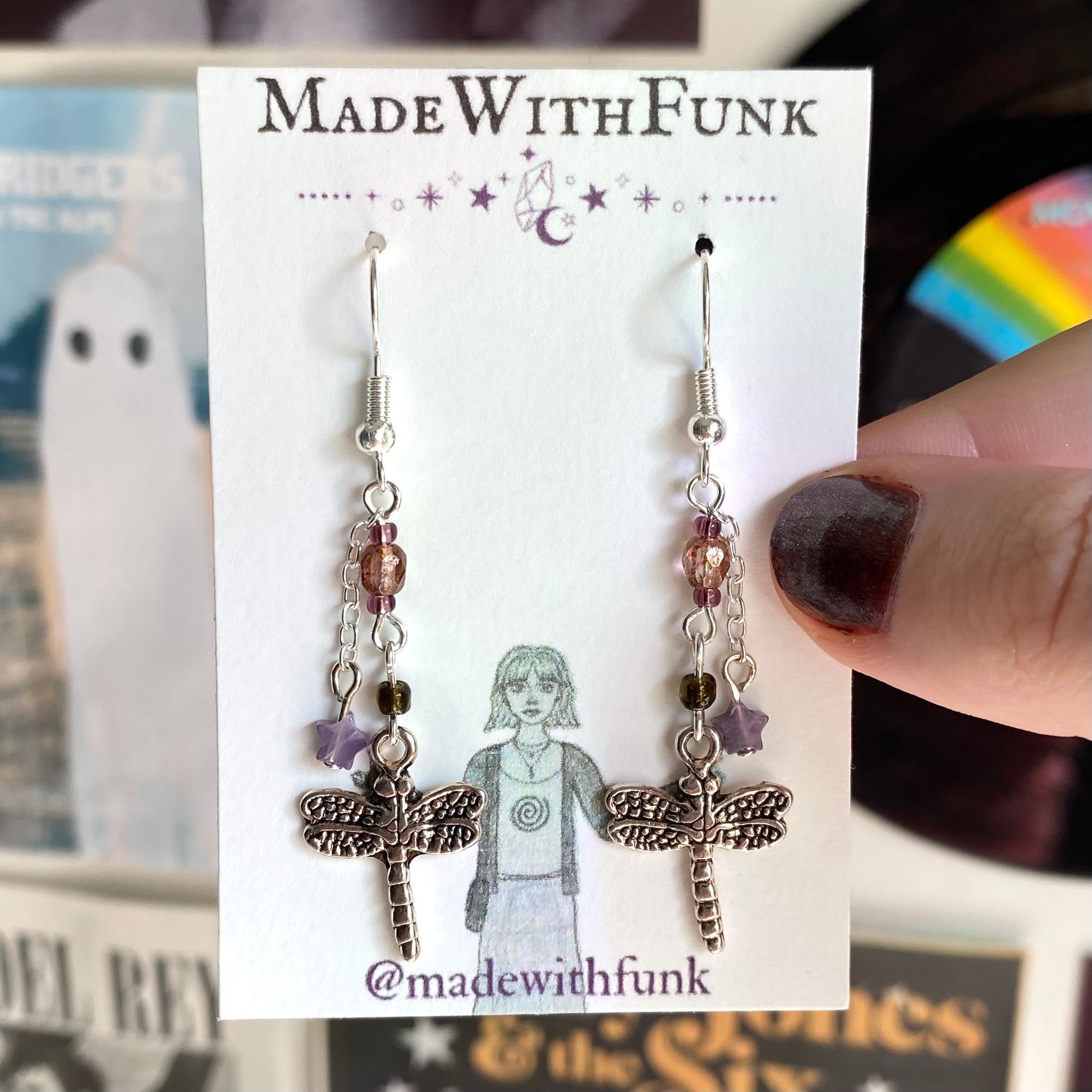 Made with a beautiful mix of glass and amethyst beads, and metal dragonfly charms.