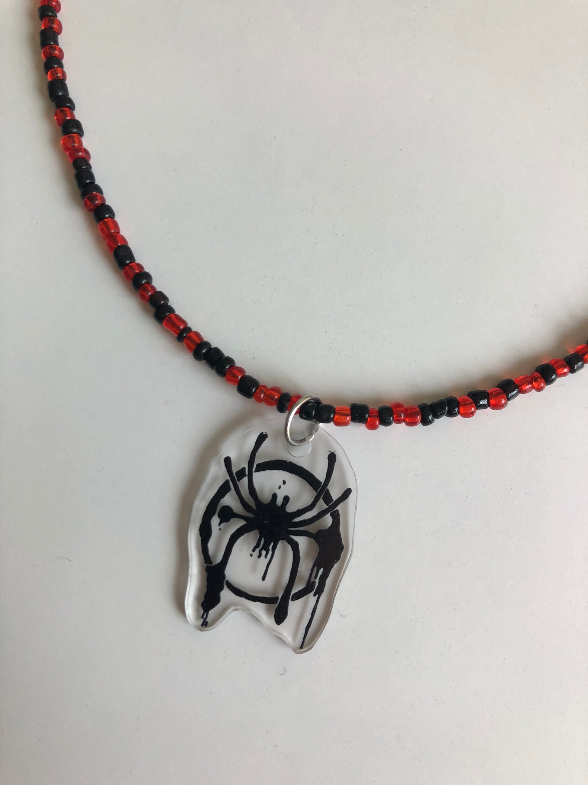 Red and black seed beads. The logo is hand-drawn on shrink plastic!