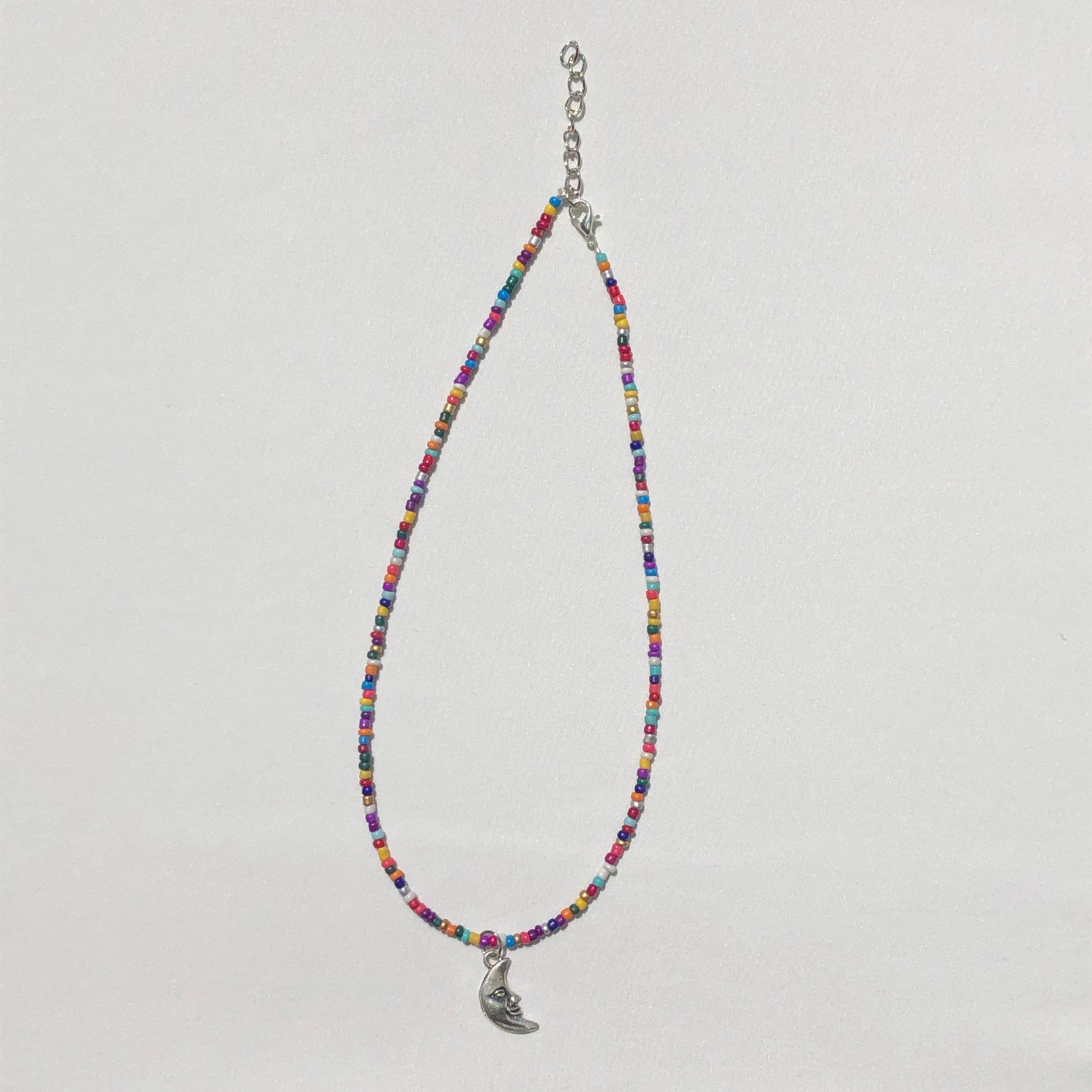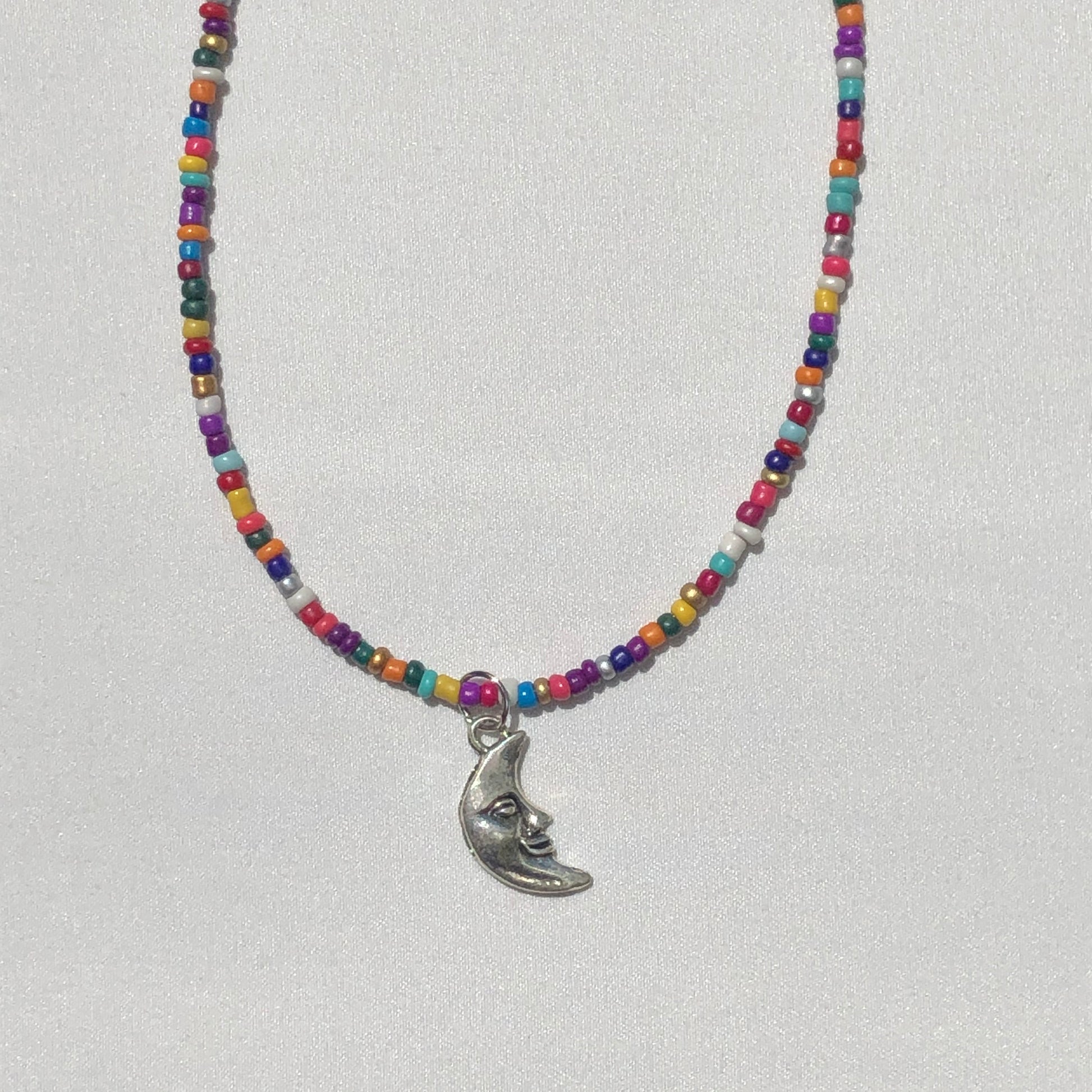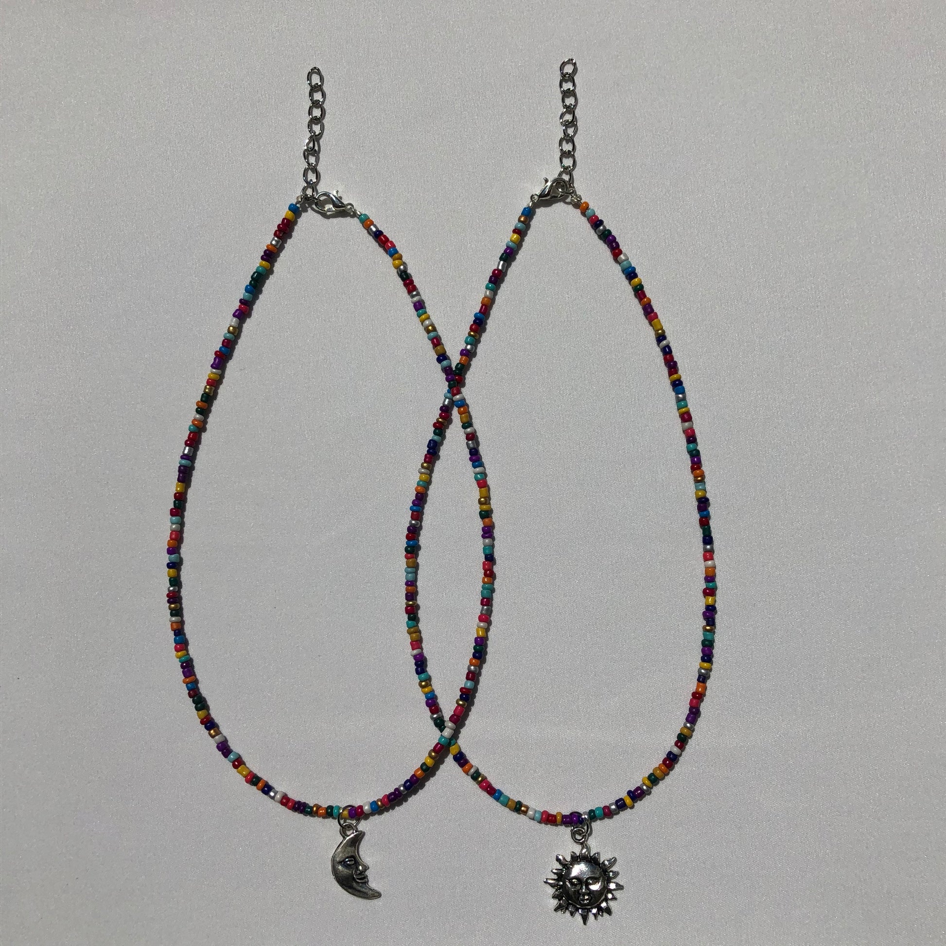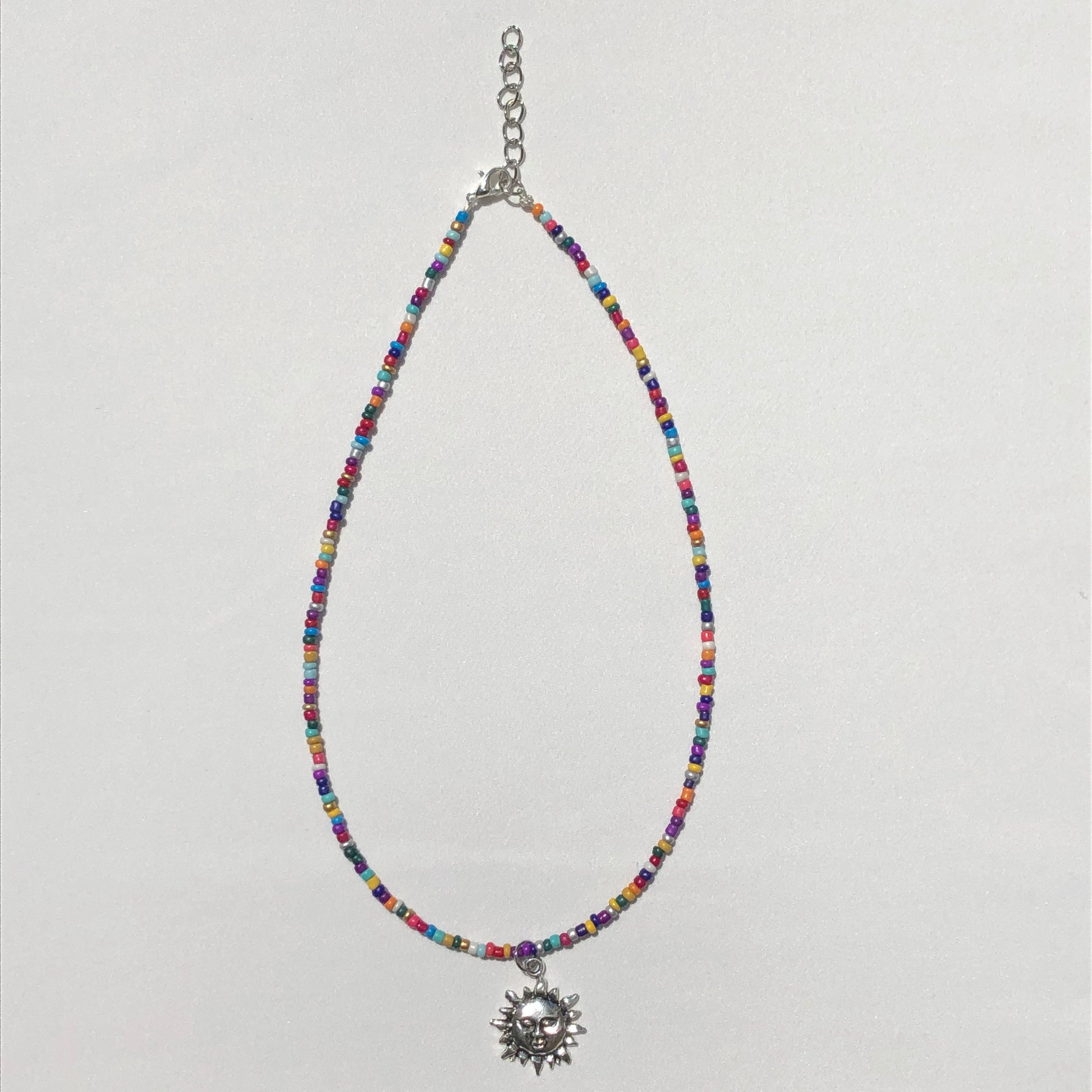 Multicolour 2mm glass seed beads with a silver sun or moon pendant of your choice.