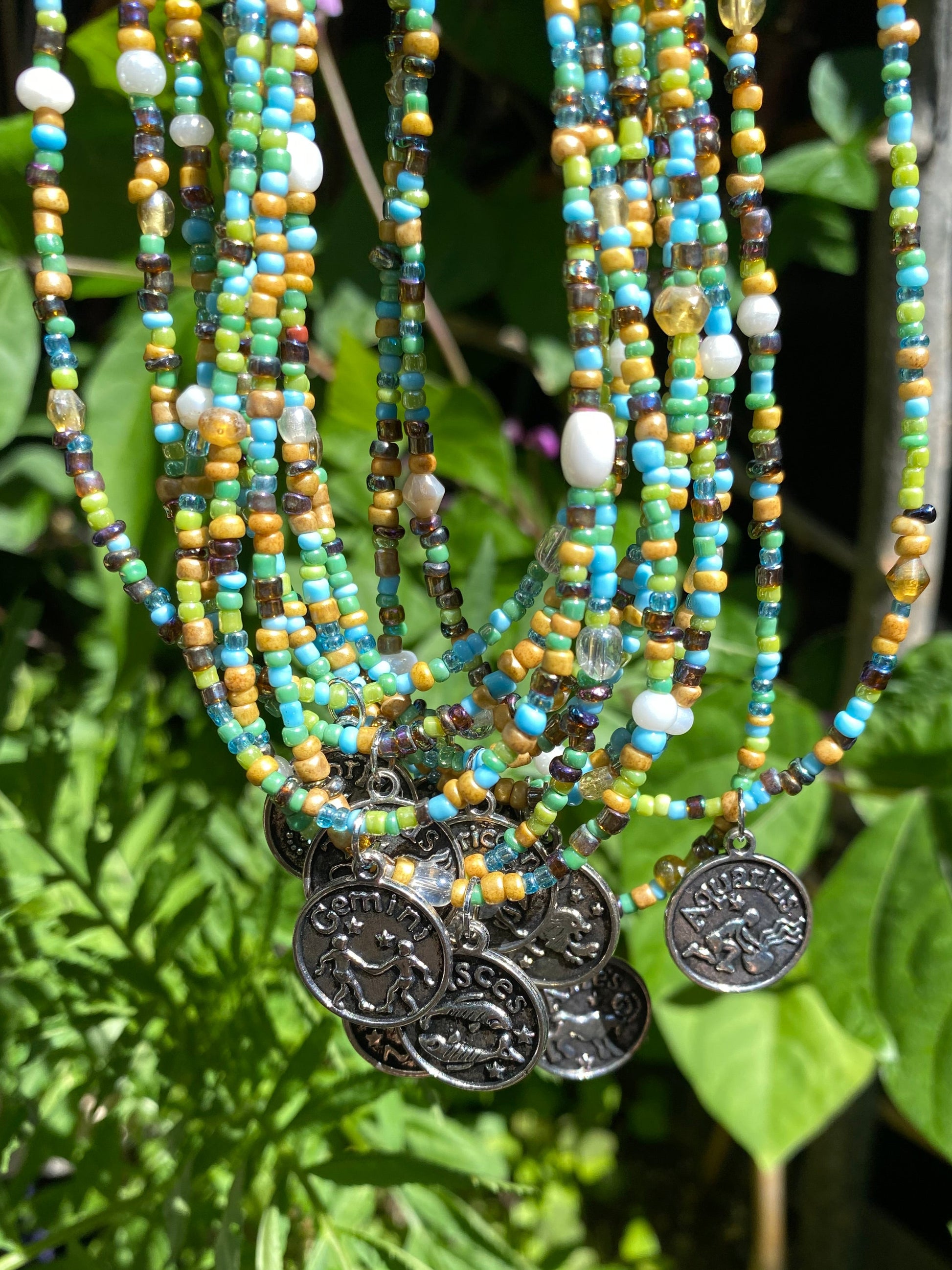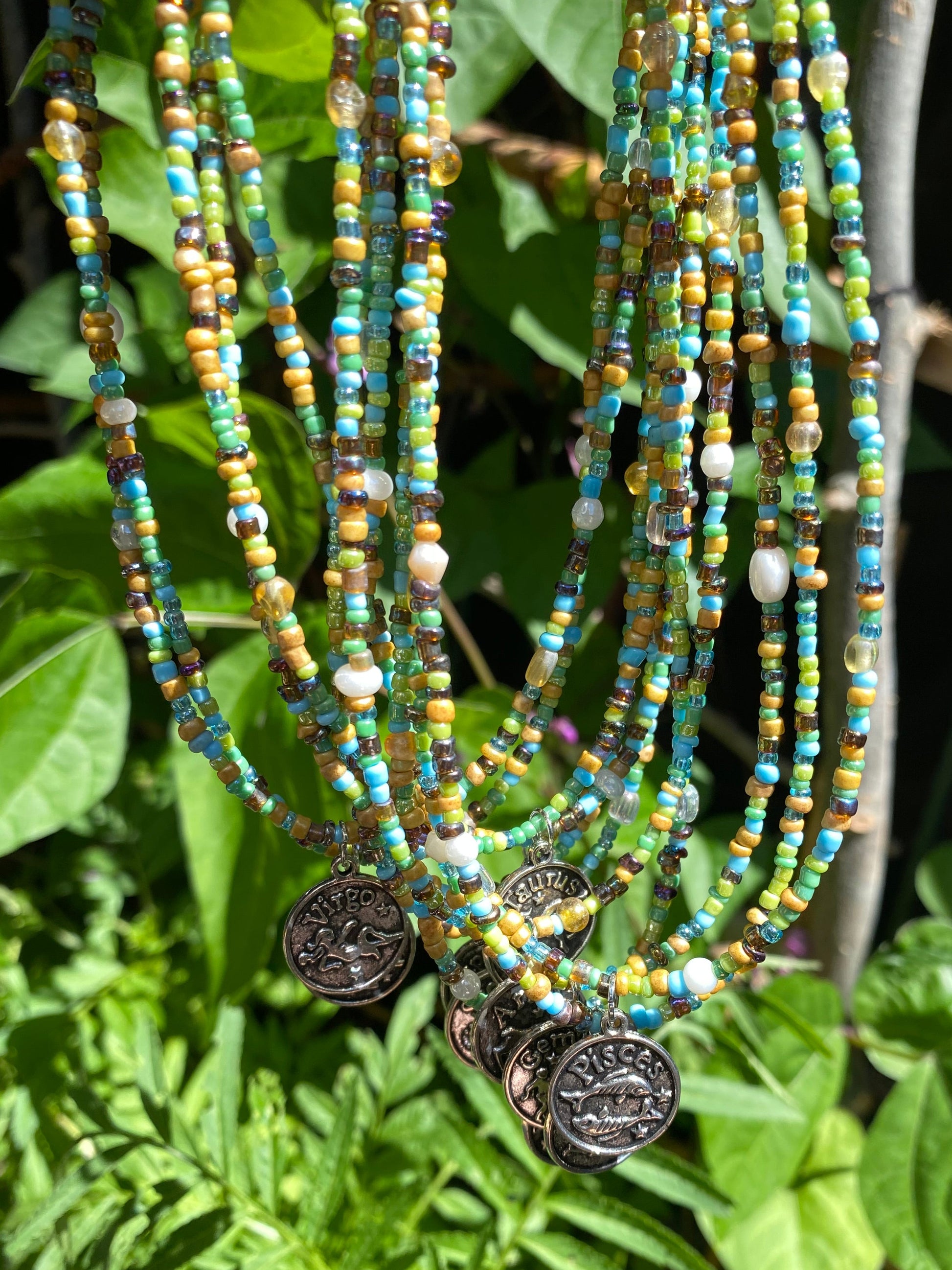Nature earth tone 2mm glass seed beads with a 17mm silver zodiac sign pendant of choice.