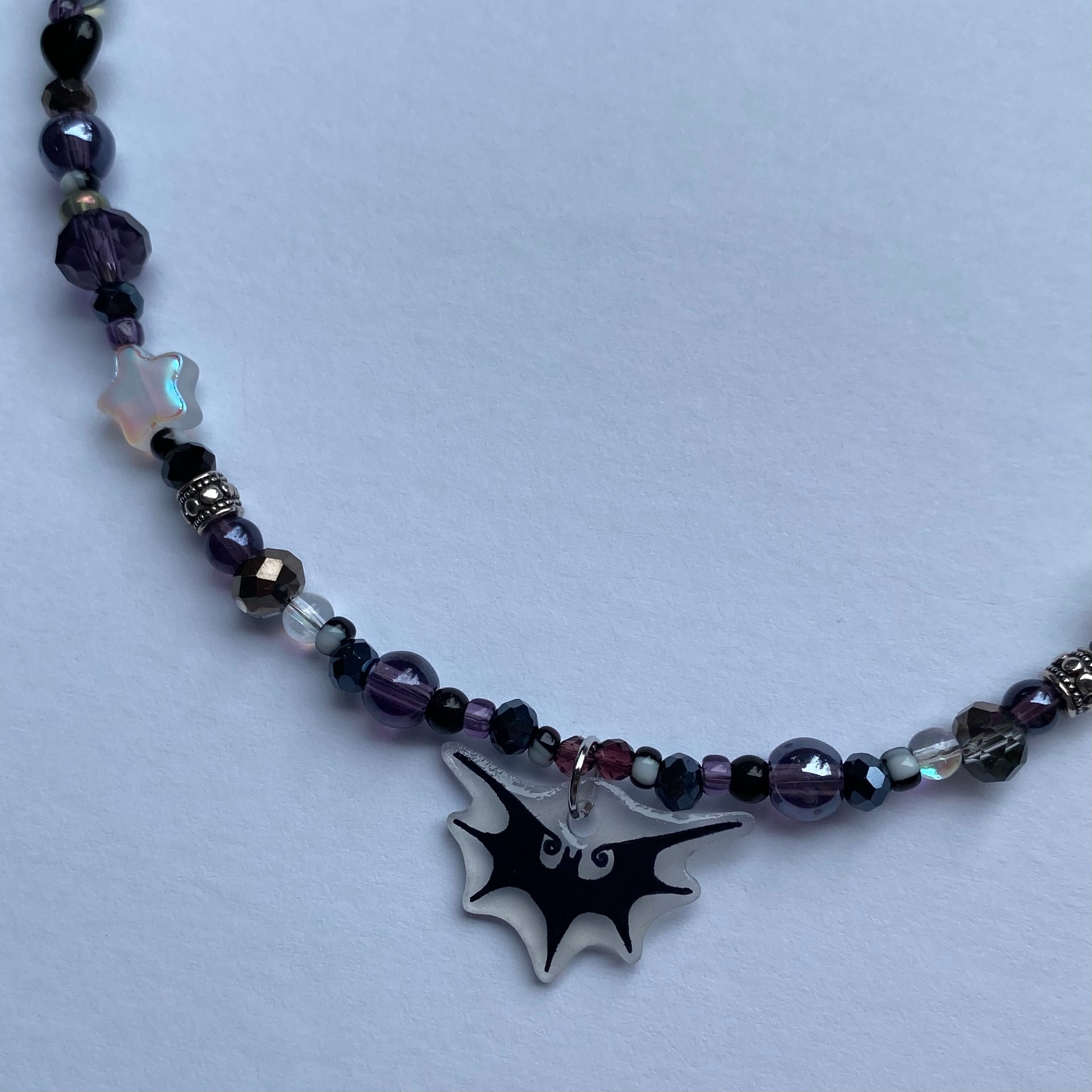 The perfect necklace for fans of The Nightmare Before Christmas!! Made with a beautiful mix of glass and metal beads. Bat charm is handmade by me with shrink plastic and sealed with dimensional mod podge!!