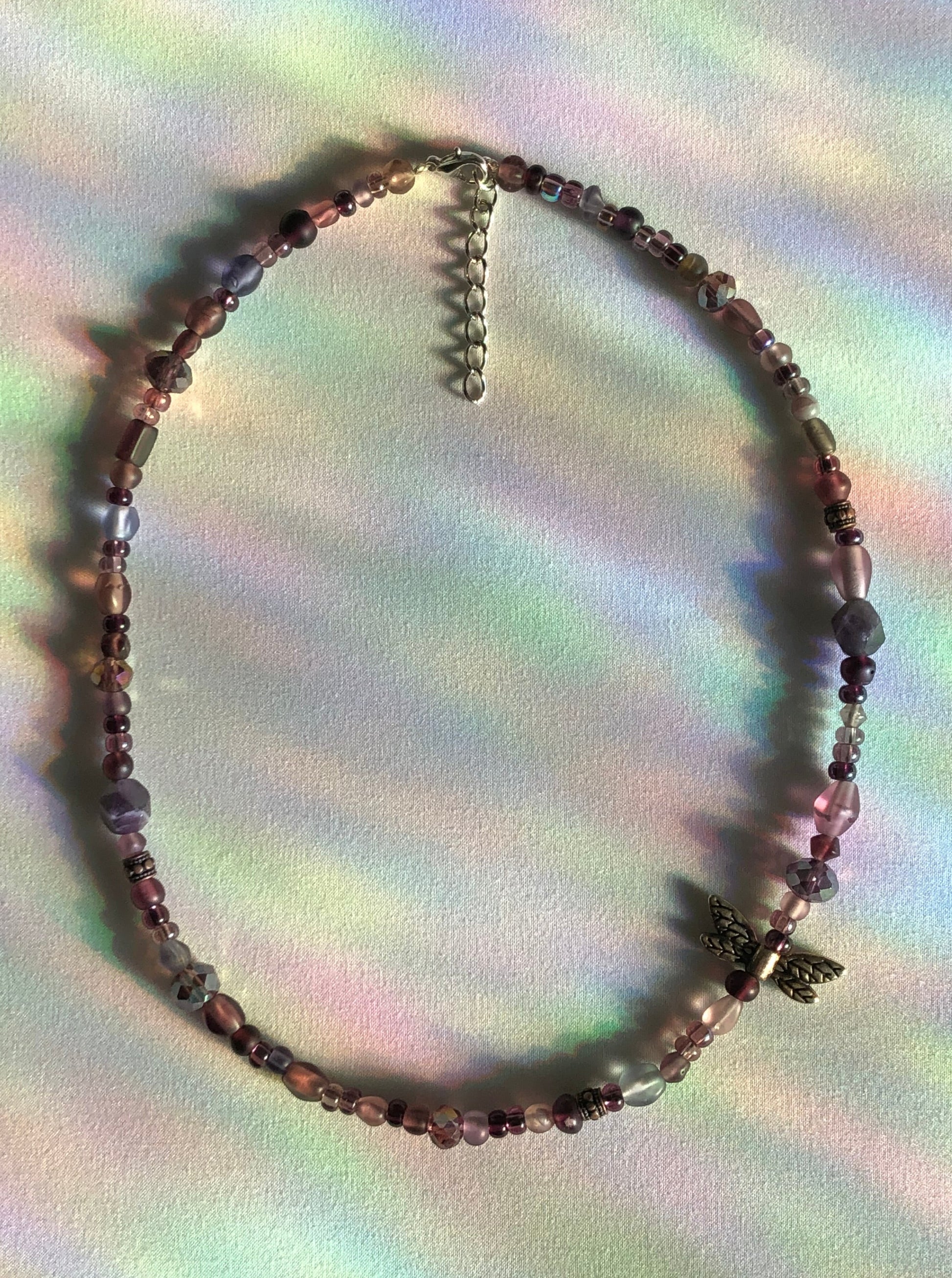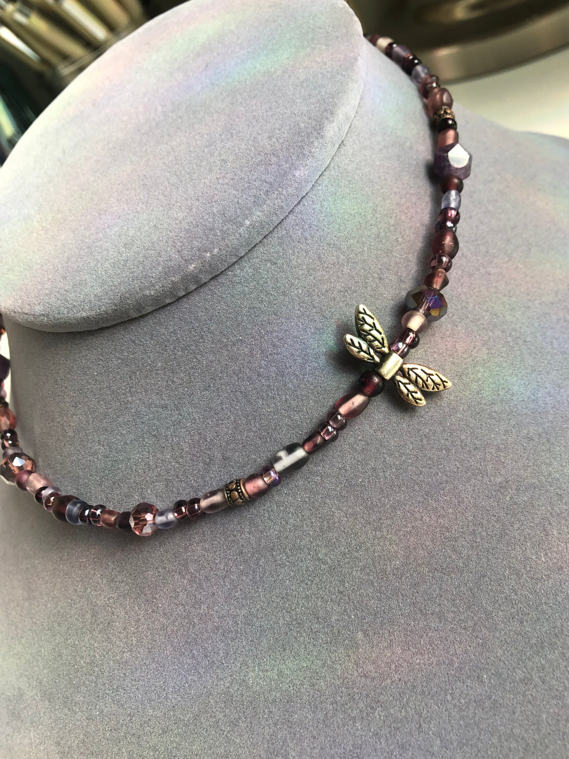 Unique mix of different purple glass beads, 8mm faceted amethyst crystal beads, 20mm x 6mm metal dragonfly bead, and 7mm x 6mm metal beads.