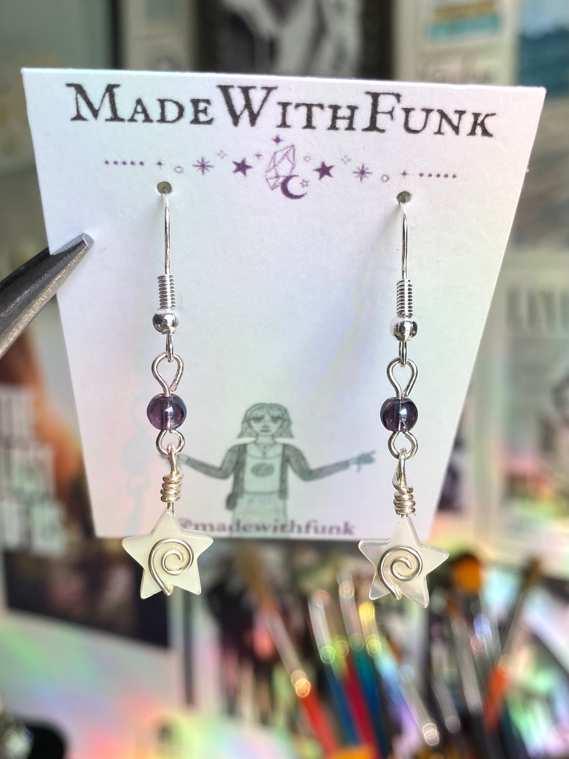Unique handmade swirly star earrings!! Made with a variety of glass and shell beads!