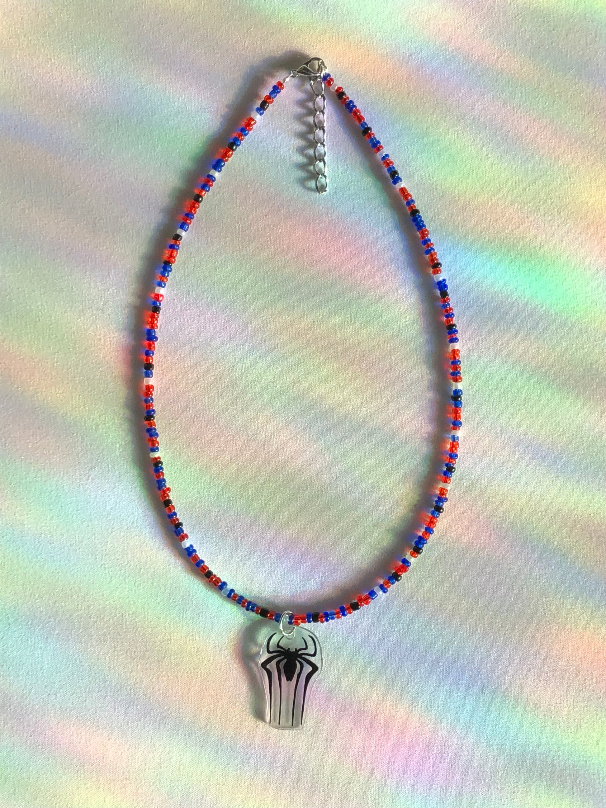 Blue, red, white, and black glass seed beads to match Spider-Man's suit. The Amazing Spider-Man logo is made on shrink plastic.
