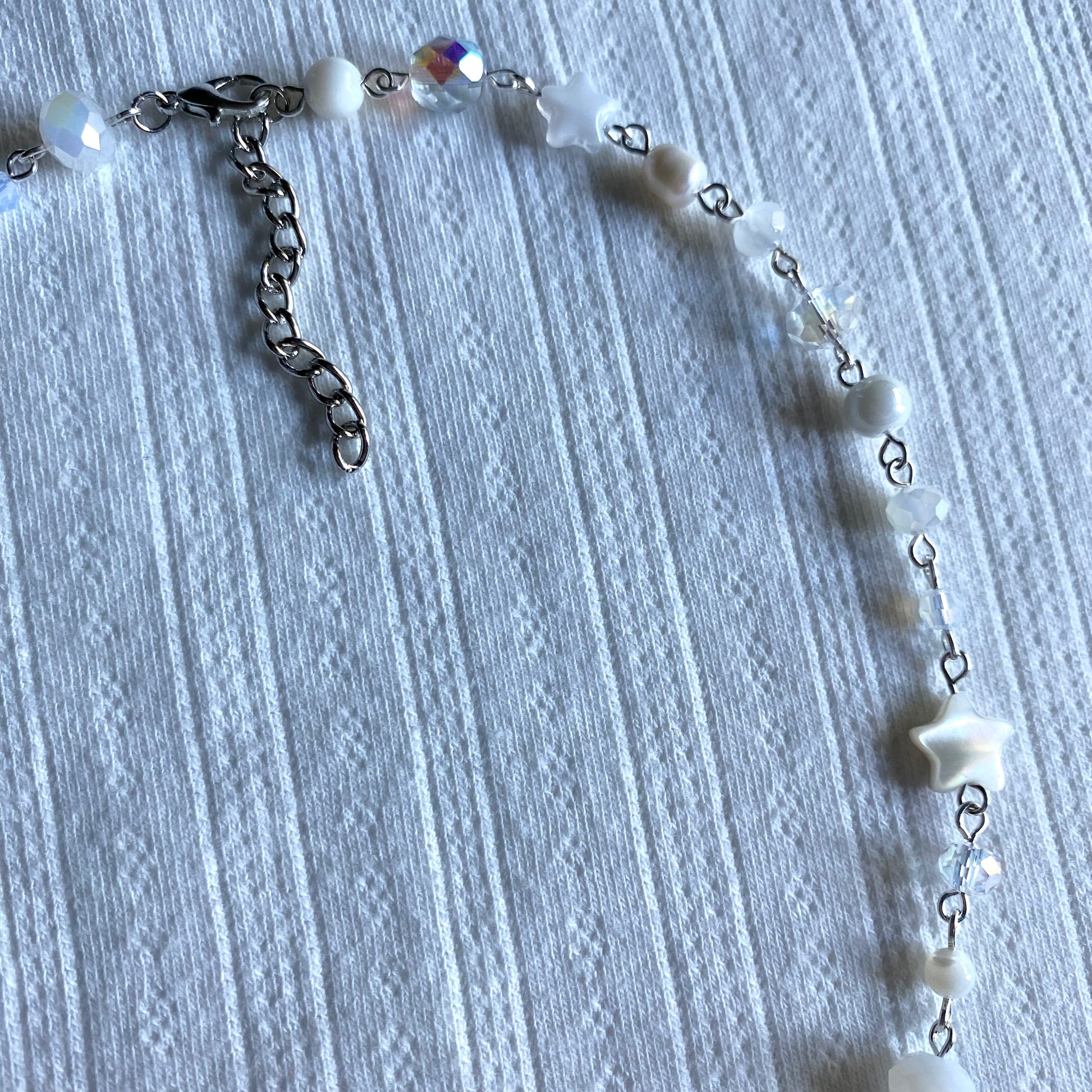 This necklace is made with metal eye pins and is connected with a lobster clasp at the back.